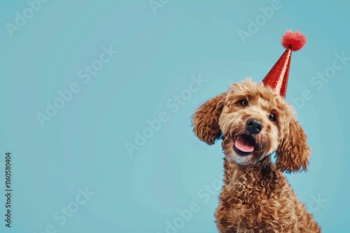 Cute dog celebrating with red pary hat and blow out against a blue background and copy space to side