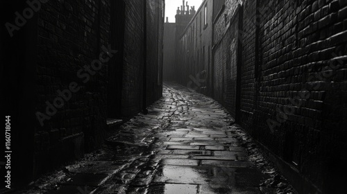 Gritty and dark urban alley at night framed by derelict buildings, rain-soaked pavement, and an eerie mist evoking ominous tension, danger, and mystery in the inner city streets