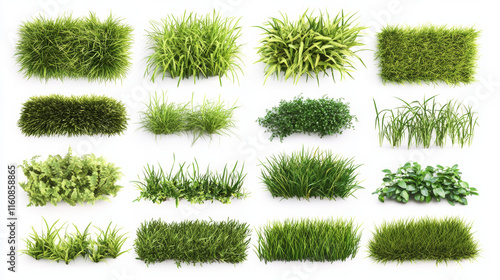 Large set of fresh green spring grass borders in differing shades of green lengths and densities for use as design elements on white