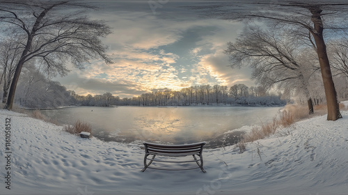 Frostige Winterlandschaft mit Bank am ruhigen See und dramatischem Himmel