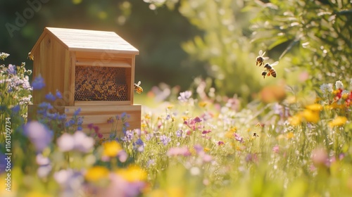 A charming wooden bee house in a colorful garden filled with vibrant wildflowers buzzing with life and beauty in the warm sunlight.