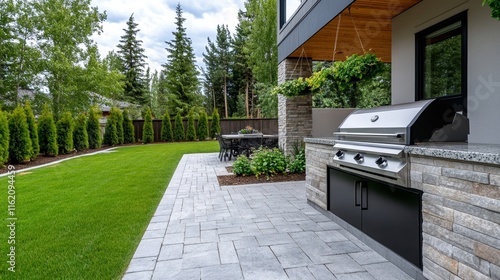 Backyard patio with a built-in barbecue, stone countertops, an outdoor dining set, and hanging herb planters, perfect for entertaining