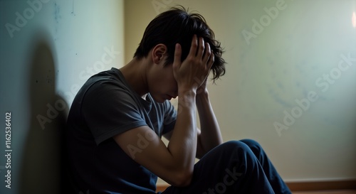 Young man sits on floor in dark room. Looks sorrowful, holds head. Seems to struggling with personal issues. Setting suggests feeling of isolation, despair. Potentially related to addiction mental
