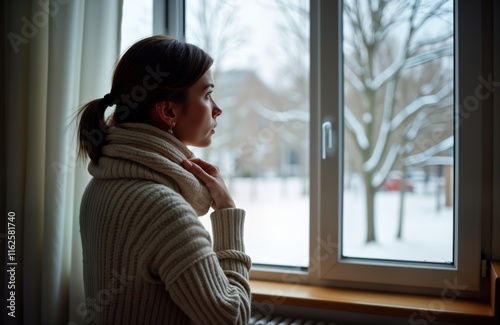 Woman sits near window looking sadly out on snowy scene. Winter day. Thoughtful contemplation. Seasonal affective disorder concept. Cozy indoors. Beige sweater. Solitude. Sadness. Winter blues. Cold