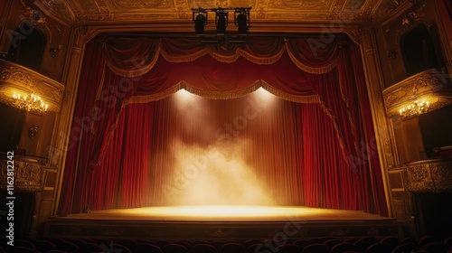 A grand theater stage with red curtains and soft lighting, ready for a performance.