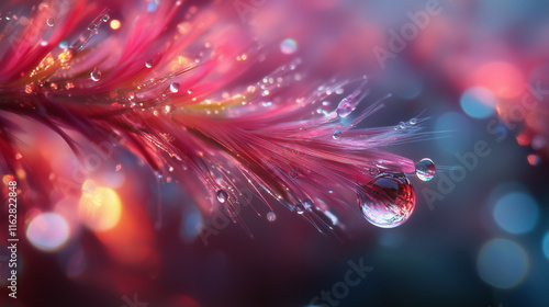 Artystyczne zbliżenie kropli rosy na źdźble trawy, ukazujące delikatne odbicie otaczającego świata i subtelne detale naturalnej tekstury.