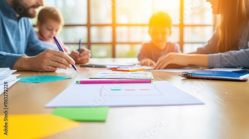 #719060164Team meeting with focus on colorful markers and chart on table.