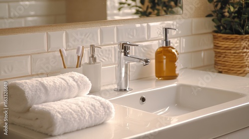 Clean bathroom sink with white towels, soap dispensers, and toothbrushes. Image ideal for showcasing bathroom products, cleanliness, and modern bathroom design.