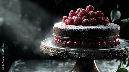 OPIS MAX 200 znaków: A decadent and indulgent chocolate cake with layers of rich ganache, topped with fresh raspberries and a dusting of powdered sugar.
