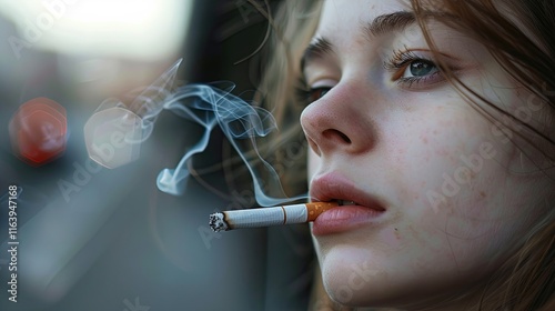 Close-up portrait of young girl with a cigarette in her mouth. Concept of harm from smoking. The effect of tobacco on the human body