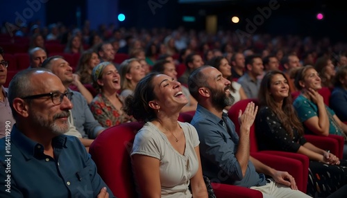 Audience laughing at a comedy festival. Red seats, camera focuses on a woman enjoying the show.