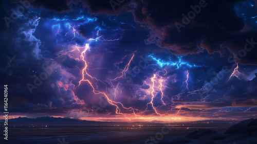 Potężna burza nad pustynią, z kilkoma uderzeniami piorunów jednocześnie przecinającymi czarne niebo.