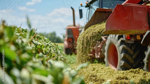 Feed loader delivering silage to agricultural machinery in field setting with blue sky and green crops during harvest season