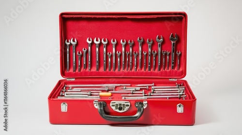A red toolbox filled with screws, nails, and essential tools, opened and displayed on a white backdrop, emphasizing the simplicity and utility of the design
