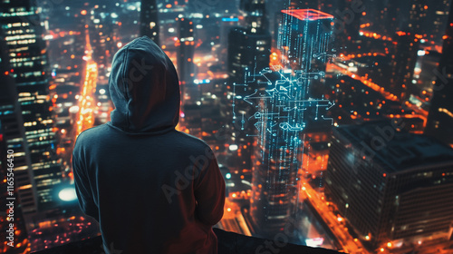 Hacker are planning to hack and attack networks and cyber security systems. Smart Innovation city with connection future wireless digital city and social media networking over the cityscape.