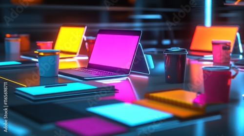 A futuristic co-working space with glowing laptops, colorful notebooks, and coffee cups on a shared sleek table.