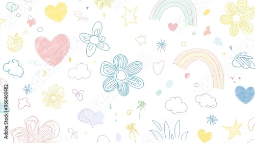 Whimsical Pastel Doodle Paradise: A Delightful Childlike Pattern of Hearts, Flowers, Rainbows, and Stars
