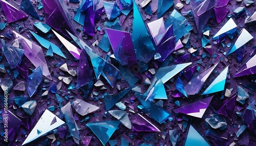 A chaotic abstract design with scattered shards of glass in vibrant purple and blue hues