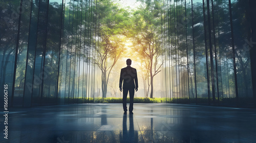 A silhouette in a serene, nature-filled environment.