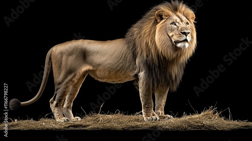 A majestic lion isolated against a black backdrop. The portrait captures the lion's regal presence, showcasing its striking features and powerful gaze. The dark background enhances the contrast