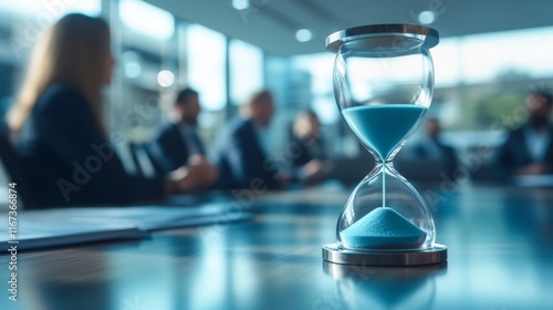 A close-up of an hourglass on a meeting table, with blurred figures in the background, symbolizing the passage of time during discussions.