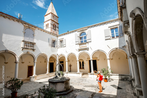 Young female traveler photographing with phone old monastery in Piran town. Traveling in Slovenia