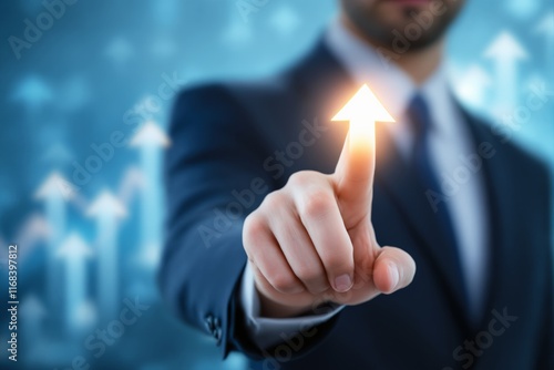 Businessman pointing at glowing upward arrow on blue background for growth concept.