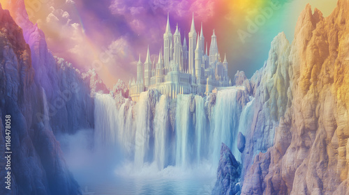 Imponujący zamek wkomponowany w potężny wodospad, gdzie woda, rozpryskując się wokół wież, tworzy magiczne tęcze w promieniach słońca.
