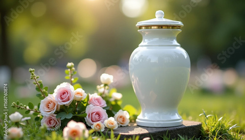 White ceramic cremation urn with flowers in cemetery setting