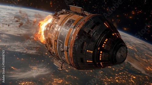 Fiery Spacecraft Re entry Over Night Earth Dramatic Orbital Descent