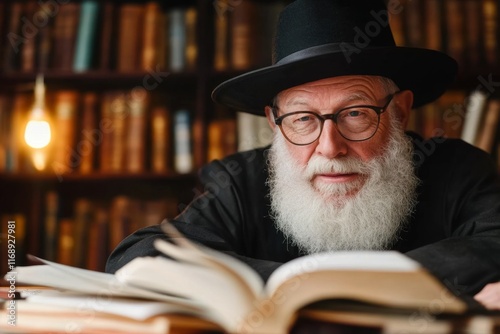 A Jewish scholar studying ancient texts in a library filled with books and scrolls