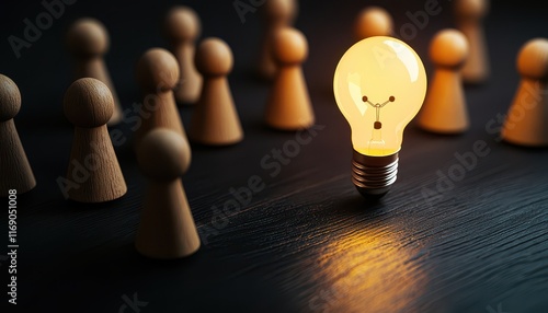 A glowing light bulb symbolizes ideas and innovation amidst blank wooden pieces.