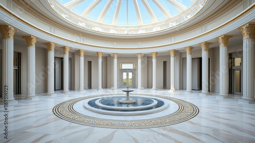 A grand Roman atrium with marble columns, mosaic floors, a central water fountain