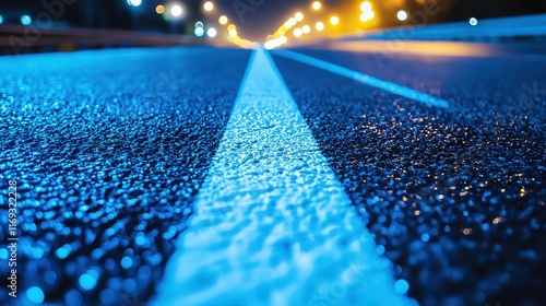 Freshly applied thermoplastic road marking glowing under streetlights, reflecting car headlights, enhancing visibility and safety in urban nighttime traffic conditions.