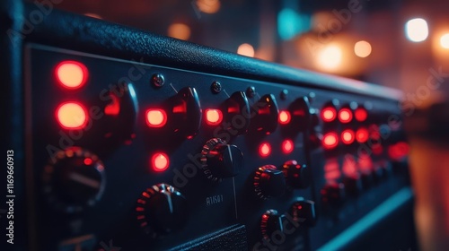 Guitar amplifier with volume knobs turned up, ready for a rock performance, sleek and modern design, electric energy