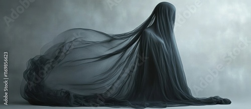 The enigmatic shrouded figure emerges from the misty ethereal environment exuding a haunting cinematic presence Cloaked in an opaque veil the figure s identity remains concealed