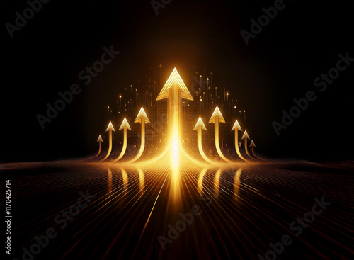 Golden arrows ascend from a glowing base, converging towards a brilliant light, symbolizing growth, success, and upward mobility. A sense of hope and progress is conveyed.