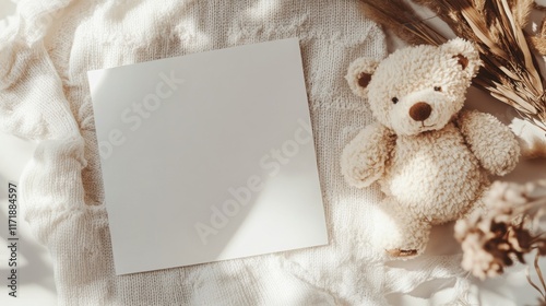 Baby Bear Nursery frame mockup, vertical white wooden frame for baby room art, baby shower announcement, top view, flat lay