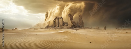 A surreal sight of a sandstorm approaching an ancient desert ruin, with towering sand clouds creating an otherworldly atmosphere, Desert scene