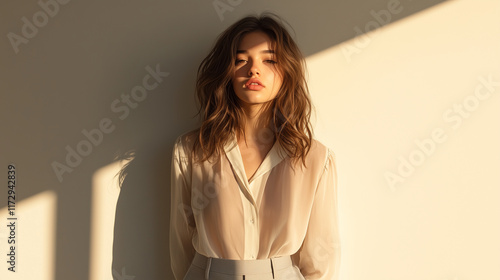 woman with long hair stands against light wall, wearing sheer blouse and high waisted pants, illuminated by soft sunlight, creating serene atmosphere.