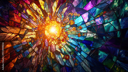 A radiant stained glass depiction of the resurrection of Jesus Christ, featuring intricate details of angels, flowers, and light beams. The colorful glass radiates vibrancy and hope