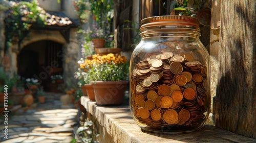 A jar filled with coins sits on a stone ledge amidst flowers.