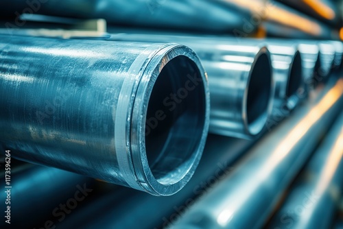Industrial steel pipes in warehouse with shiny metallic surface and cylindrical shape.