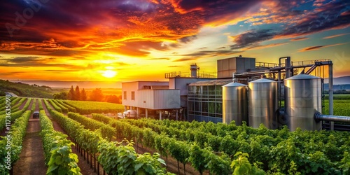 Vineyard Landscape with Winery and Wine Bottle Production Process, Showing Filtering System