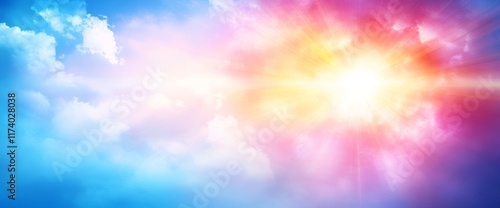 An enchanting image of a double rainbow set against pastel clouds and a brilliant blue sky, with a sun casting glowing rays and a striking double rainbow arching gracefully in the right corner,