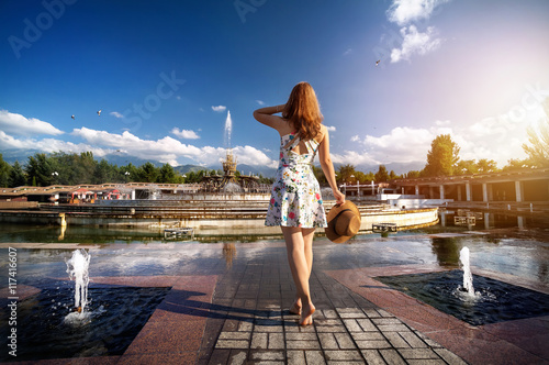Summertime girl near fountain