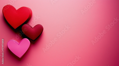 Czerwone i różowe papierowe serca rozproszone na pastelowym różowym tle, tworzące minimalistyczny i romantyczny motyw idealny na Walentynkowe projekty.