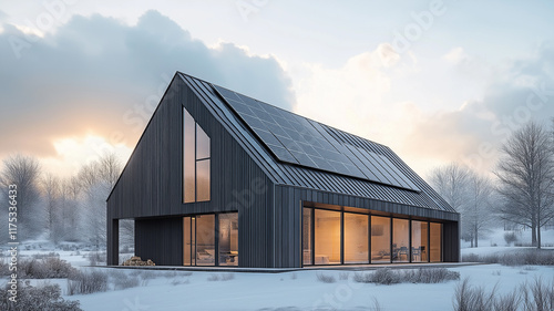 Dom jednorodzinny w stylu nowoczesnej stodoły z zainstalowana instalacją fotowoltaiczną