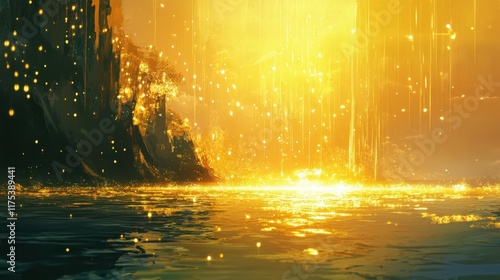 Golden Light Falls Upon a Calm Water Body Near Dark Cliffs