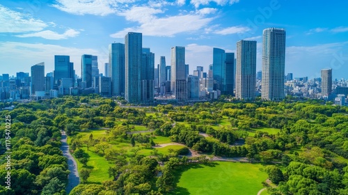 City skyline with park.